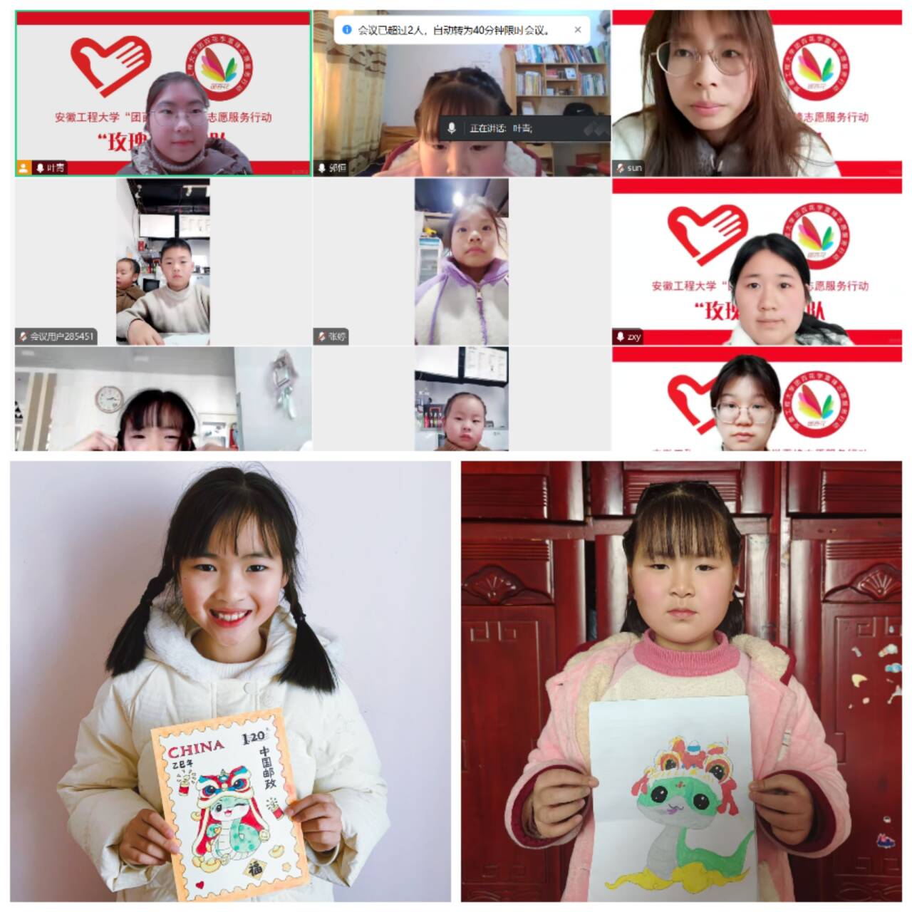 大手拉小手,共同迎春节。“小朋友们,再过几天就要过年了,可以跟姐姐说说你们所在的家乡都有哪些传统习俗吗?”“玫瑰花”团队负责人叶青向安徽各地的小朋友们亲切地询问。志愿者们结合生动有趣的图片与故事,向小朋友们介绍饺子和汤圆的文化寓意,为孩子们讲解了扫尘、贴春联的传统习俗,让孩子们了解到北方和南方过年习俗虽略有区别,但都一样寄托了对来年美好生活的祝愿。志愿者们还指导孩子们猜谜语、绘制蛇年纪念邮票画,共同营造欢欢喜喜过大年的热闹氛围。