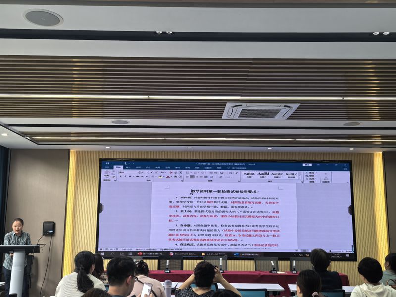 校督导王永忠为老师们做了教学资料规范化培训,结合第一轮教学资料专项检查情况,强调了审核评估教学资料检查的重点,根据典型案例分析常见问题,全体教师分享了试卷分析、课程小结等环节撰写的经验。