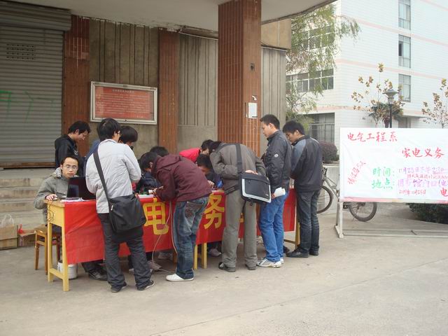 根据第八届院大学生课外学术科技节活动的安排, 12月5,由电气工程系团总支主办、电子科技协会协办的家电义务维修活动在院学术报告厅旁举行。下午2:00,电子科技协会的同学就早早的摆好工作台,开始了近三个小时的维修活动。