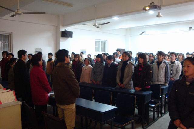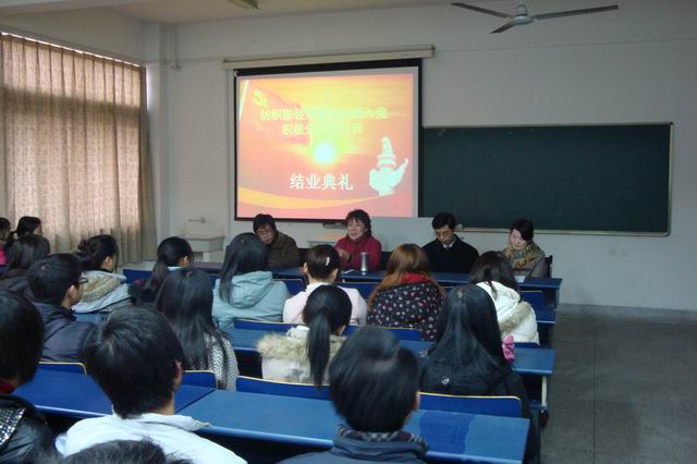 20091230下午4:30,纺织服装系第十五期入党积极分子培训班结业典礼在D413多媒体教室隆重举行。系党总支书记、分校校长余新霞老师,系党总支副书记、分校副校长刘金斌老师,系学生第一党支部书记李恒奎老师等出席本次结业典礼。本次典礼由班主任毕亚琴老师主持。