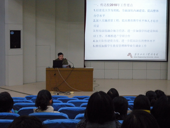 会议着重部署了图书馆2010年工作。徐军同志强调,2010年图书馆将紧密围绕学校的中心工作,一方面以“细节体现关爱,微笑展示真诚”为载体将“读者第一,服务至上”的工作理念落到实处;一方面以文献资源建设、读者服务、参考咨询为着力点,不断提升服务水平,把我校图书馆建设成为传统服务与数字服务相补充、文献服务与信息服务相结合的文献信息中心,为建设现代大学提供有力的文献资源支撑。