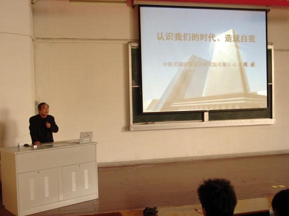 2011年11月16日下午,中铁芜湖建筑设计研究院有限公司总经理、院长周晓(高级工程师、国家注册投资咨询工程师)来校作了一场题为“认识我们的时代,造就自我”的专题讲座。建筑工程学院院长陆峰教授、土木工程专业负责人韩有民老师和全体2011级土木工程专业新生参加了本次专题讲座。整个讲座在热情洋溢的气氛中进行。