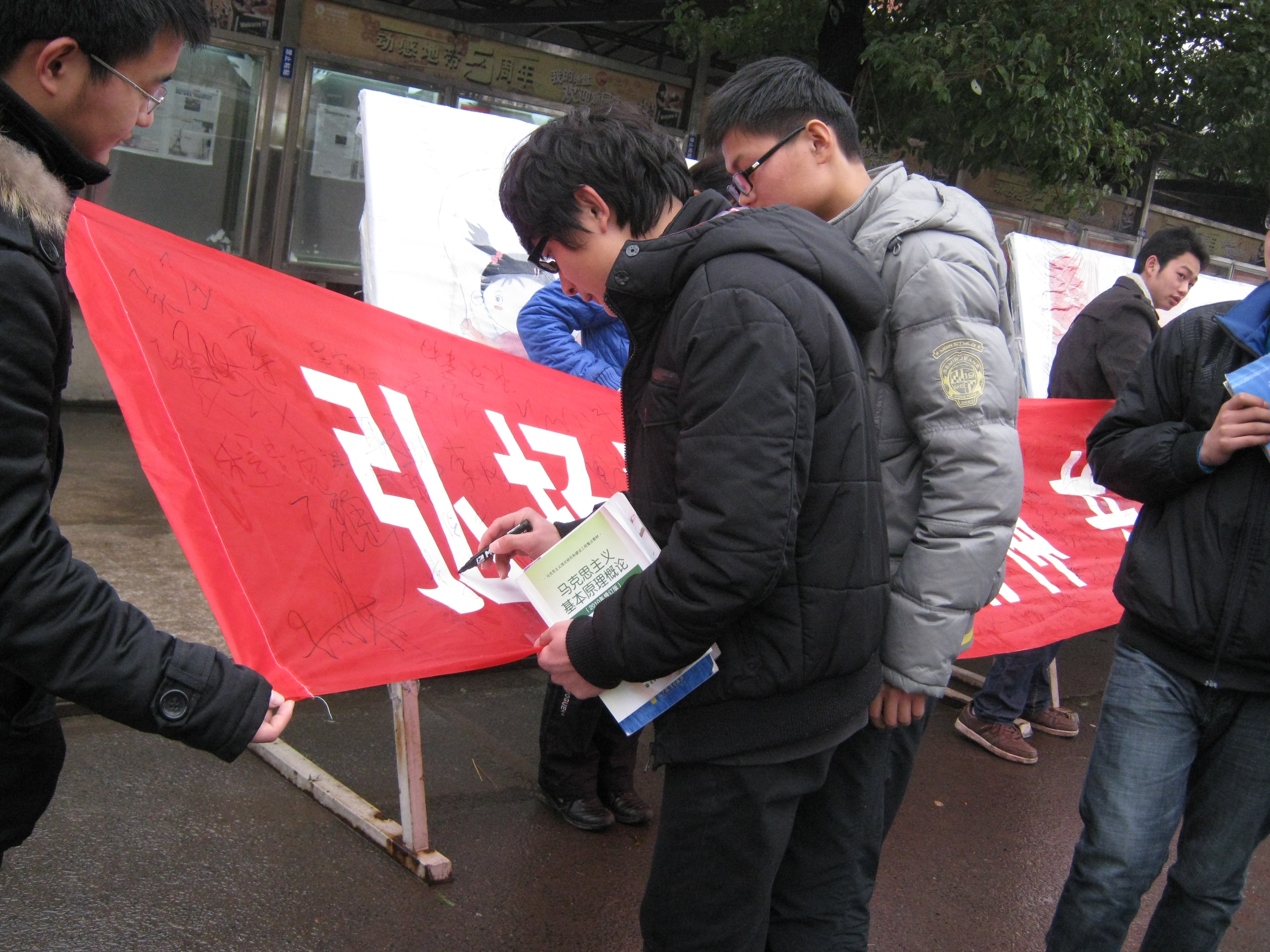 为大力弘扬雷锋精神,不断提升广大同学的道德素质和文明程度,营造学习实践雷锋精神的浓厚氛围,电气工程学院志愿者服务队于35中午在三食堂门口开展了以弘扬雷锋精神,共建和谐校园为主题的签名活动。作为“90的当代大学生,同学们纷纷用签字笔在鲜红的条幅上签上自己的姓名,表达了自己坚决向雷锋同志学习的决心。本次签名活动在全校范围内进一步宣传了雷锋精神,在广大同学中更加深入地发起了实践雷锋精神的倡议。