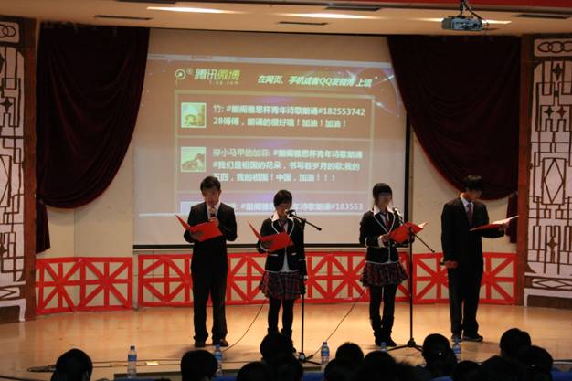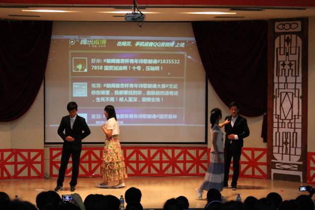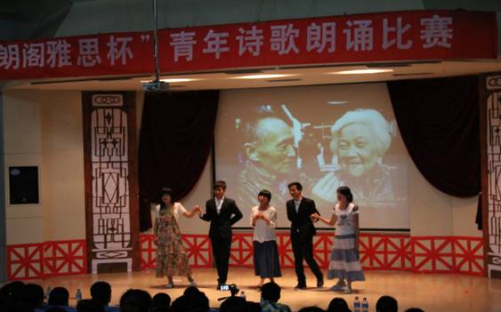 经过初赛的选拔,来自我院各专业的十组选手齐聚一堂,进行最后的角逐。本次比赛分为自选诗歌朗诵和随机应变两个环节,在激情澎湃的集体朗诵《五四,永不息》后,比赛正式拉开帷幕。来自我院国贸111班齐燕、陈冬霞等同学朗诵的原创诗歌《园丁颂》声情并茂、绘声绘色的歌颂了广大辛勤教书育人的老师们,浓郁的青春气息以及搭配的情景剧表演形式给现场观众留下了深刻的印象。工商111班周玲玲、李祥等同学朗诵的《我的祖国》以慷慨激昂的情调表达了对祖国的无限热爱和对中华民族不屈不挠精神的深深叹服。一篇《生死不离》在物工112班高留艳同学的动情演绎中表达了对灾区人民的关爱之情,同时赞颂了5·12地震中涌现的一批英雄人物。最后,由国贸112班王飞、张霄、黄家琪、吴兰兰等同学朗诵的舒婷经典著作《致橡树》将歌曲、舞蹈等艺术表现形式与朗诵完美结合,他们以饱满的热情、轻盈的舞蹈展现了文革结束后年轻人对爱情的勇敢追逐,也表现了现代大学生对高尚爱情的向往之情。在随后进行的随机应变环节,各位选手通过对经典影视剧配音、声泪俱下读菜谱等颠覆正常情感的段子将现场气氛带到另一个高潮。比赛过程中场下观众通过微博上墙平台发送微博表达自己对五四精神的理解以及对场上选手的支持,整个朗诵比赛精彩纷呈、掌声如潮。赛后,来自营销101班的袁伟同学为大家深情演唱了《暗香》。