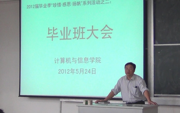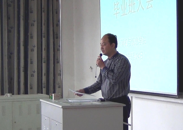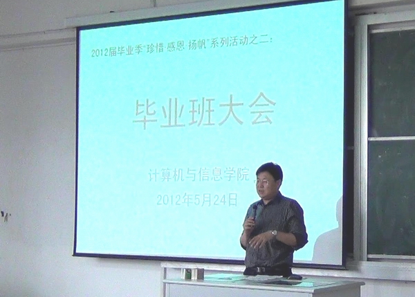 5月24日上午,计算机与信息学院在2号教学楼207教室召开全体毕业班学生大会,对毕业设计结尾工作和文明离校工作进行布置动员。院党委书记邬海量、党委副书记周毅仁、副院长汪军、院团委书记方玖胜和毕业班辅导员罗国旗老师出席会议,会议由院党委副书记周毅仁主持。
