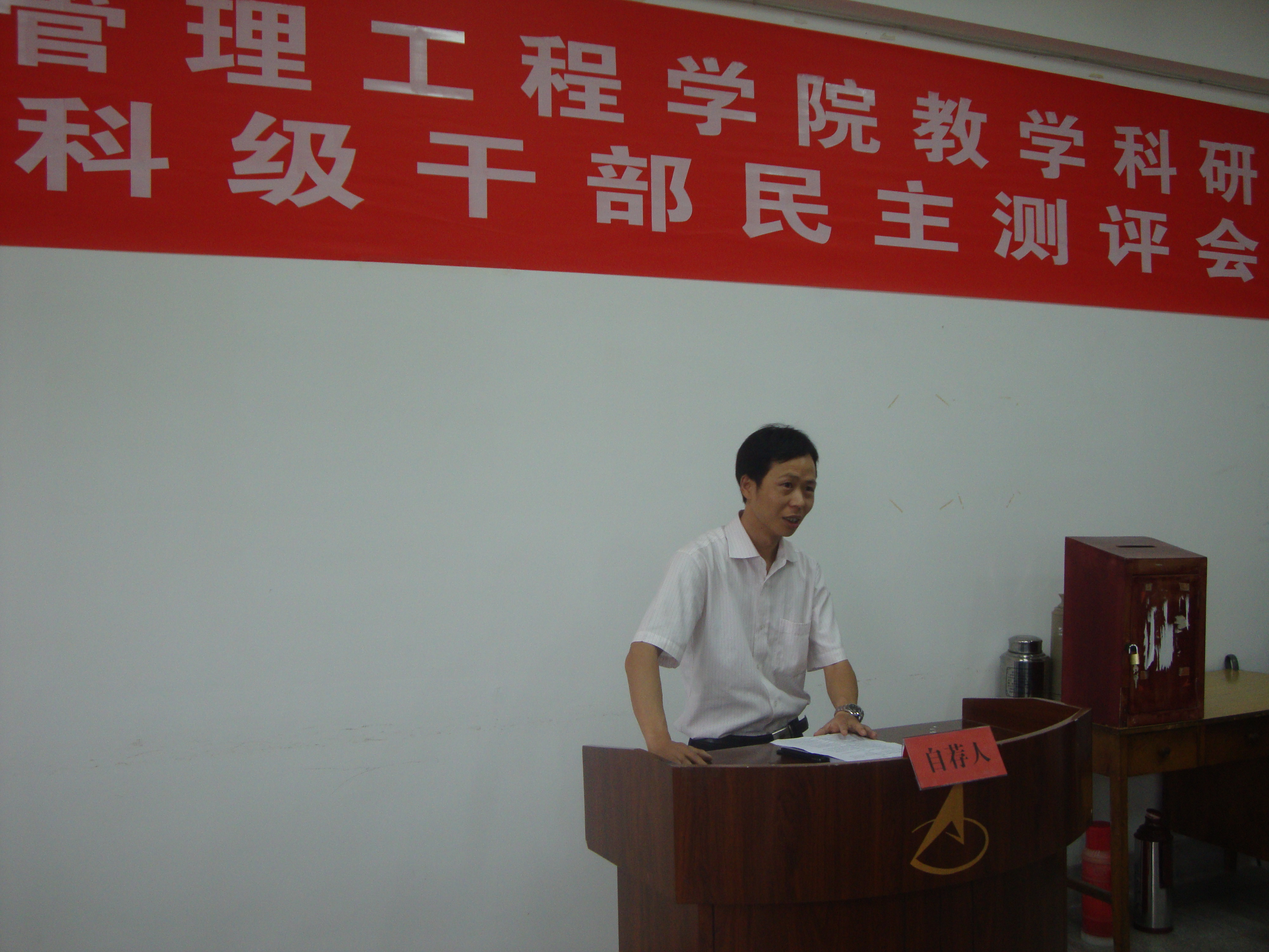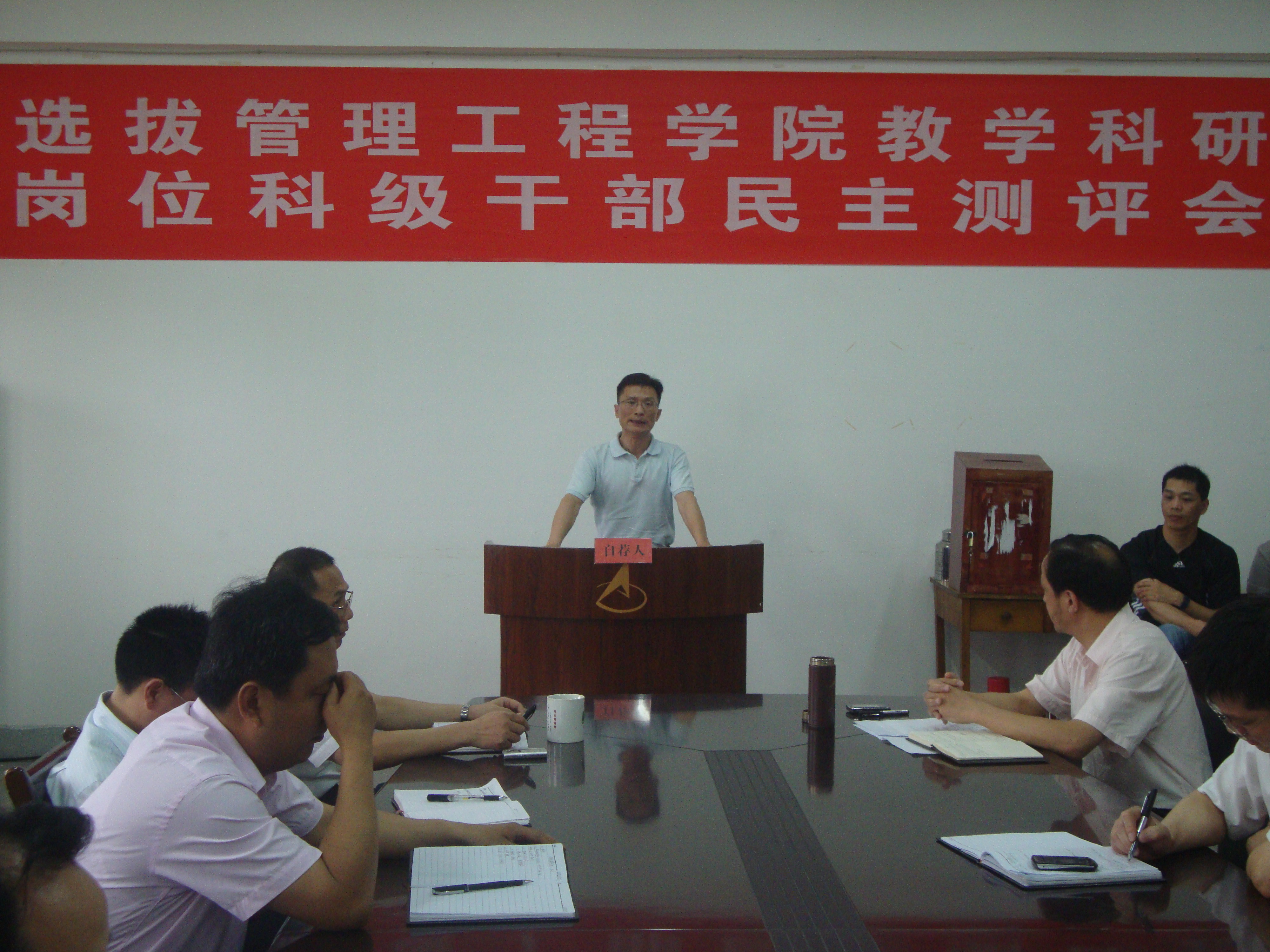 汪张林书记首先介绍了学院党委前期在选拔教学科研岗位科级干部所做的宣传、组织自荐和资格审查工作等具体情况,对符合资格审查的自荐人情况向与会人员做了详细说明。第二项议程为自荐经济贸易系主任或副主任岗位的三名教师分别就个人基本情况介绍、近几年的主要工作业绩以及对申报岗位的设想进行个人陈述。最后与会人员对申报8个岗位的15名自荐人进行了民主测评。