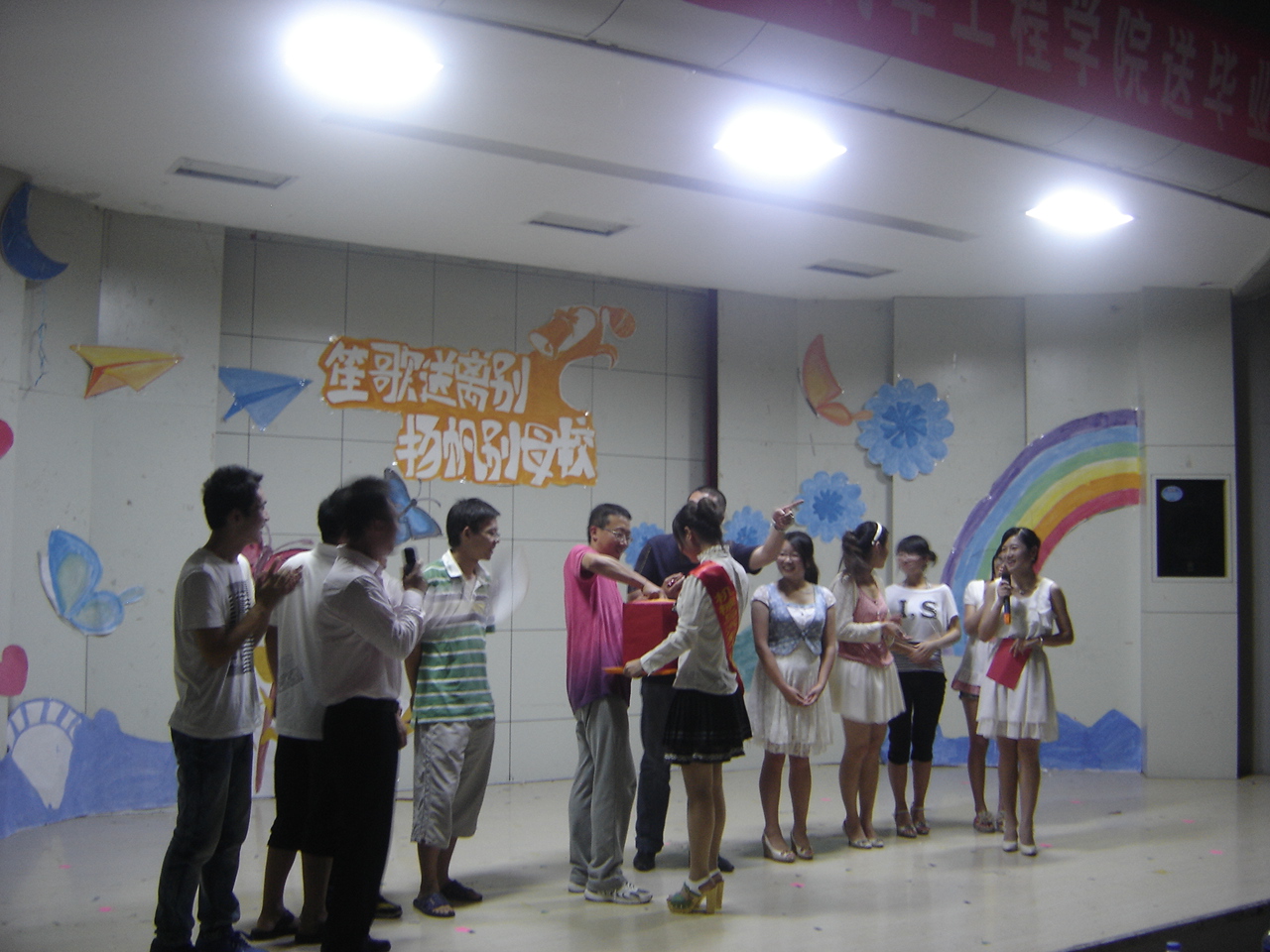 一个接一个的精彩节目呈现在观众眼前,整场晚会气氛活跃。风趣的相声,搞笑的小品,动听的歌曲,优美的舞蹈赢来了观众阵阵掌声和欢呼。一段熟悉的《神话》旋律被生化院的同学们用口琴、丝竹和二胡巧妙地结合,将晚会推向高潮。中场的互动环节“心心相印”则是迎来了晚会的另一个高潮,四组同学和两名老师分别登台,你比划我来猜,生动的肢体语言引发了一阵阵欢笑声。一支秀色纷呈的舞蹈为本次送毕业生晚会画上了圆满的句号。
