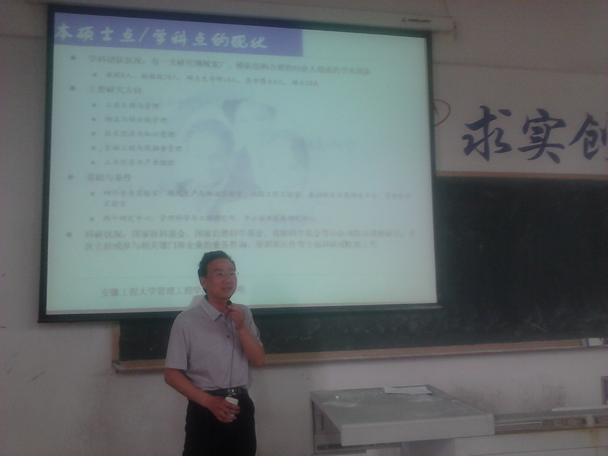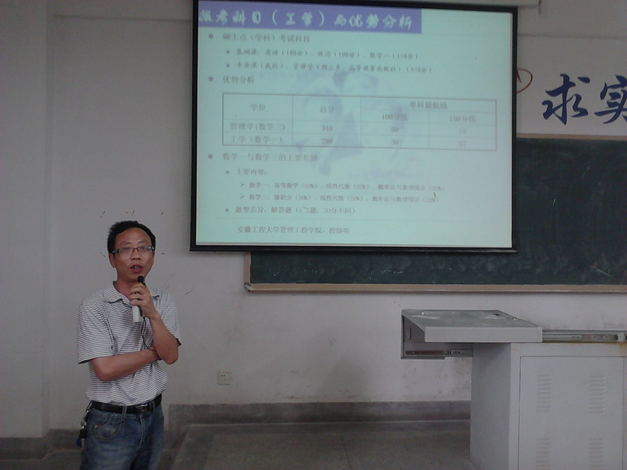 6月21日下午四点半,管理工程学院2013年考研动员大会在4教201举行,管理工程学院副院长龚本刚教授、副书记何朝林教授、管理科学与工程重点学科负责人程幼明教授以及100余名有意考研的同学参加了会议。会议由何朝林副书记主持。程幼明教授首先从我校管理科学与工程重点学科的诞生历史以及现状做了详细介绍,接着结合目前的考研政策就报考我校管理科学与工程专业研究生做了优势分析。龚本刚副院长在接下来的讲话中,鼓励大家寻找适合自己的考研路径,选好专业,做好体力和毅力的双重储备。何朝林副书记在最后的讲话中勉励大家早做准备,明确方向,奋力一搏,争取优异的成绩。最后,三位老师还就同学们关心的问题做了解答。