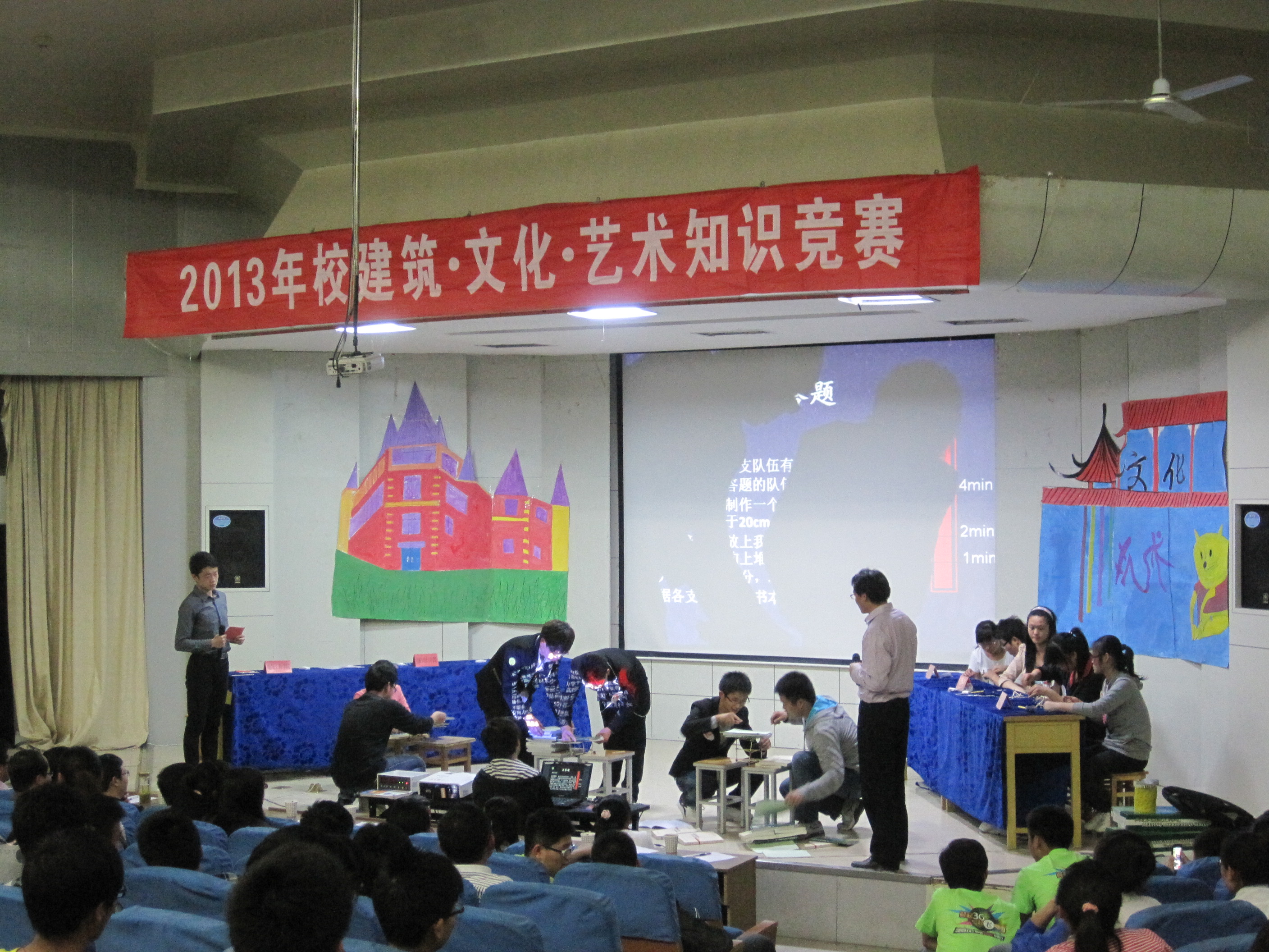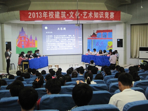5月2日晚7:00,由校团委主办、建筑工程学院团委、学生会承办、建筑协会协办的校2013年建筑文化艺术知识竞赛决赛在学术报告厅举行。校团委副书记冉昆玉、建工学院党总支书记徐达奇、副书记李烨、副院长何芝仙等观看比赛。大赛特邀建筑工程学院教师韩有民、俞梦璇、艺术学院教师齐宛菀担任比赛仲裁。
