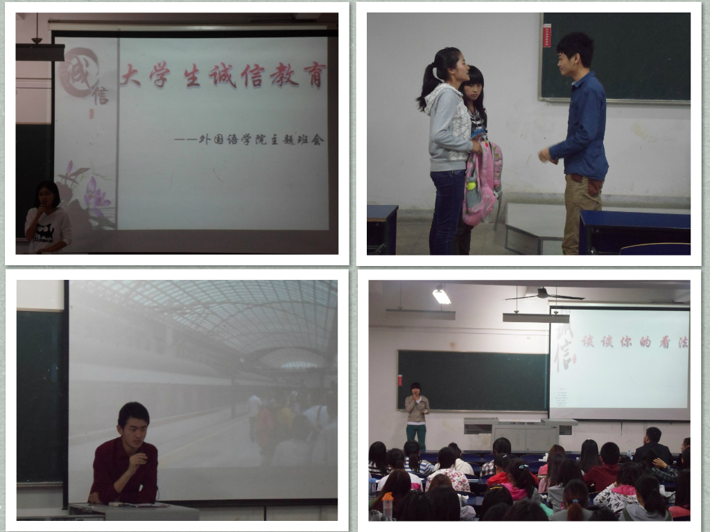 本次活动从12级学生自编自演的关于诚信的正反两个小故事开始。两个小故事生动地展现出了不同的人对诚信的不同态度。接下来,来自各个班级的同学也踊跃发言,通过自身经历的小故事向大家表明了自己对于诚信的看法,以及诚信对亲情和友情的重要性。紧接着,老师也通过他购买体育器材的一次经历和同学们分享了“被他人无条件的信任是一种极好的感觉”;他还从学校“三做”育人理念的角度阐释了诚信的必要性以及如何做到诚信,他告诉大家要把诚信内化为做人的基本要求和个性品质,从小事做起,从点滴做起,让诚信成为一种习惯。最后,老师再次从考试诚信和资助诚信等两个方面强调了“以诚信为本”的重要性,她要求同学们要树立诚信观念、增强法律意识、珍惜个人信用记录,言行一致,表里如一。