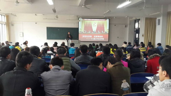 王效首先为大家普及了“中央全会”的知识,随后重点对《中共中央关于全面深化改革若干重大问题的决定》进行了全面详实的分析,尤其是对《决定》第二部分关于经济、政治、文化、社会、生态以及国防和军队建设部分出现的新提法、新名词、新举措做了重点解读。与会师生认真地听取了报告。