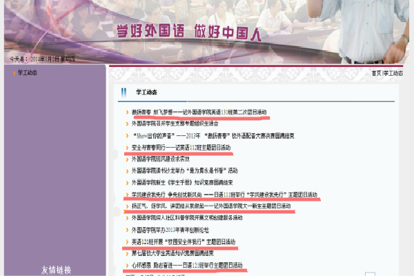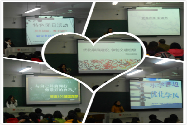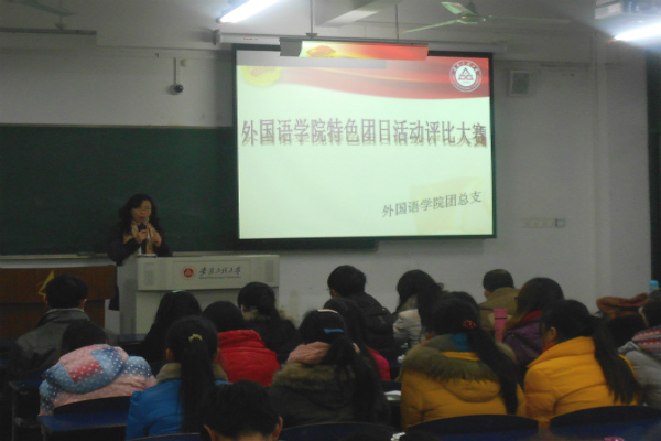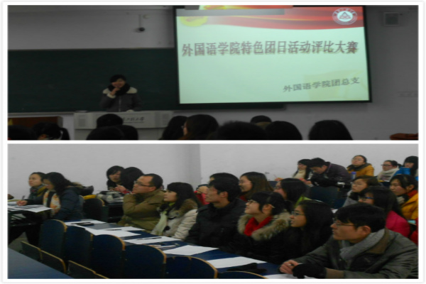 12月26下午,外国语学院“特色团日活动”评比举行。本次活动由院团总支主办,担任此次比赛评委为院全体辅导员和学生会主席团全体成员。院党总支副书记谈丽华,院团总支副书记余本祺以及全院各班班长和团干参加了整场活动。