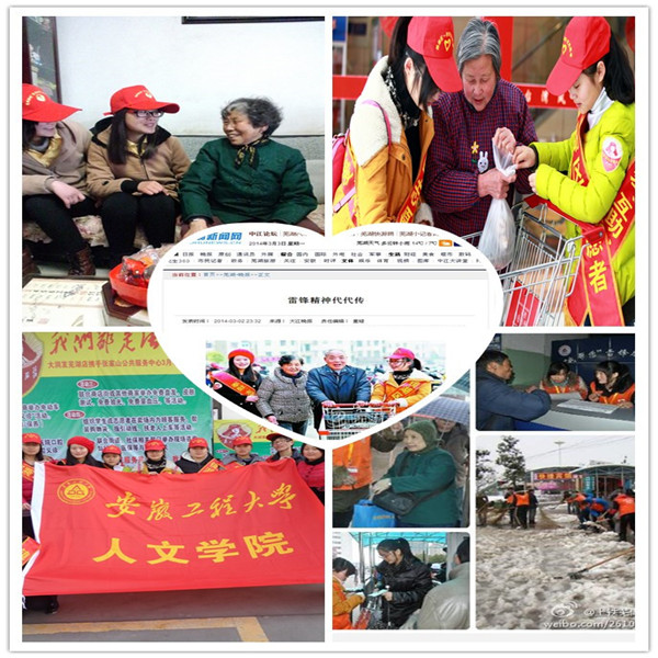 3月2日,人文学院行政管理(专升本)132班的“锦簇花团”志愿服务团队在芜湖市大润发超市开展“学雷锋,雷锋精神永相传”的志愿者服务活动,拉开了人文学院和“锦簇花团”志愿服务的序幕。在镜湖区张家山公共服务中心工作人员的协助下,志愿者们热情投身于工作之中。他们志愿指路,免费为路人量血压,协助老人购物并送其上车回家。本次活动得到社会大众的广泛赞誉,也受到社会媒体的广泛关注。3月3日,芜湖《大江晚报》A3社会新闻版以“雷锋精神代代传”进行了报道,《芜湖新闻网》也进行了转载。