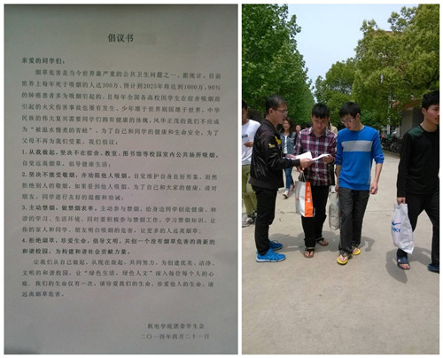 为保护同学们的身心健康,杜绝因吸烟而引发的宿舍安全事故,机电学院团委、学生会面向全校学生开展戒烟禁烟倡议宣传活动。