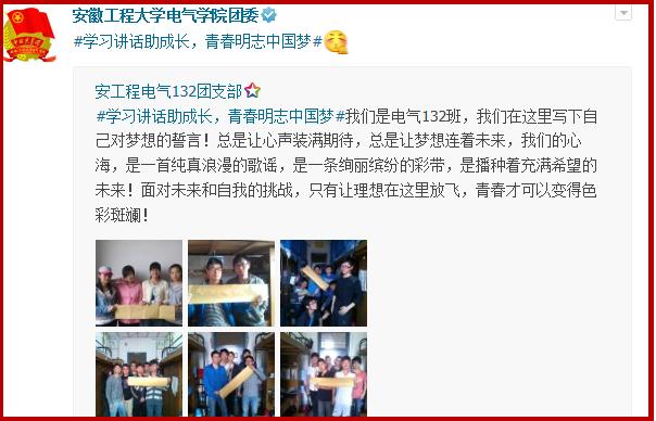 此次团日活动采用线上和线下两个部分同时进行的方式,通过主题班会、微博讨论、梦想照片、视频展示等多种形式让同学们将中国梦与青年大学生的青春梦紧密联系在一起,号召团员青年深入学习贯彻习近平总书记系列重要讲话精神,以奋斗之青春共筑中国梦。学院各个团支部积极响应,纷纷组织团员青年积极参加,线下主题团会、演讲比赛精彩纷呈,线上微博关注度和讨论热情持续高涨。电气132班团支部在微博上这样写道:“我们在这里写下自己对梦想的誓言,总是让心声装满期待,总是让梦想连着未来,我们的心海,是一首纯真浪漫的歌谣,是一条绚丽缤纷的彩带,是播种着充满希望的未来!面对未来和自我的挑战,只有让理想在这里放飞,青春才可以变得色彩斑斓!”