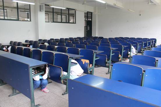 地震逃生演练在5号教学楼举行。发出警笛声后,学生迅速抱头蹲到课桌下方,听到“地震暂停,发现火情,请迅速撤离”的信号后,同学用湿毛巾捂住自己的口鼻安全、快速、有序地撤离至安全地带。