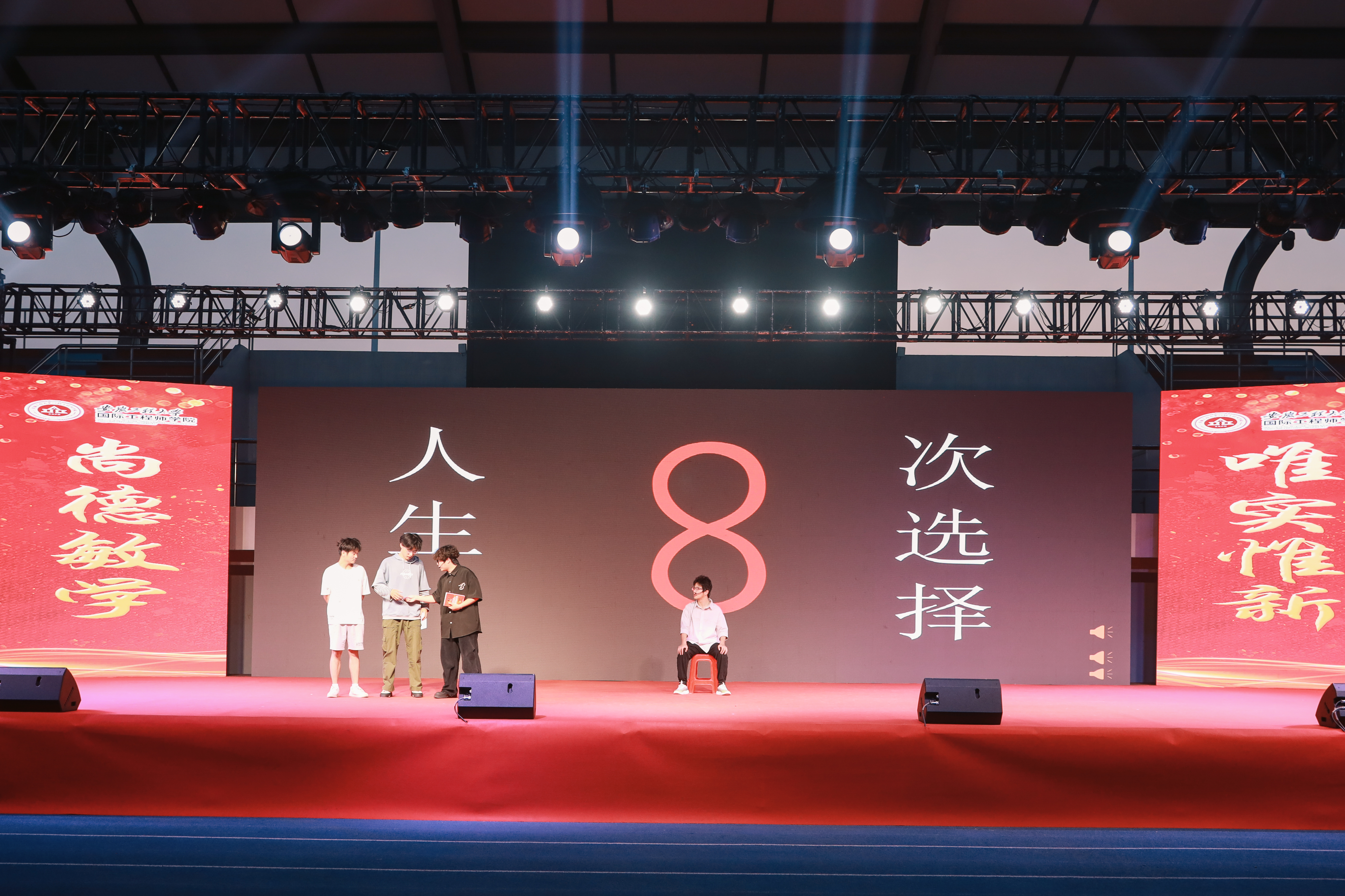 晚会现场热闹非凡,青春的旋律飘荡在校园的每一个角落。开场节目舞蹈《new Vibe》活力登场,激情瞬间点燃全场,舞者们用轻盈灵动的舞步、充满感染力的节奏,将年轻人的青春活力展现得淋漓尽致;表演唱《少年中国说》气势磅礴,“少年强则国强”的呐喊声声入耳,激发了在场师生的爱国热情,也让毕业学子们在迈向新征程之际,更加坚定了肩负时代使命的决心;歌曲《找自己》旋律悠扬、歌词动人,引发了毕业生们对大学四年人生经历的深刻思考,以及对未来的无限憧憬;话剧《人生的八次选择》则通过生动的表演,让观众们在欢笑与感动中,对人生道路上的抉择有了更深刻的感悟;歌曲串烧《凤凰花开的路口》将毕业季的不舍氛围推向高潮,熟悉的旋律唤起了毕业生们对校园生活的美好回忆;沙画表演《大鱼海棠》为观众们带来了一场别具一格的视觉盛宴,细腻的沙粒在表演者的手中灵动变幻,勾勒出一幅幅绚丽的画面,寓意着毕业生们即将开启的人生新旅程。