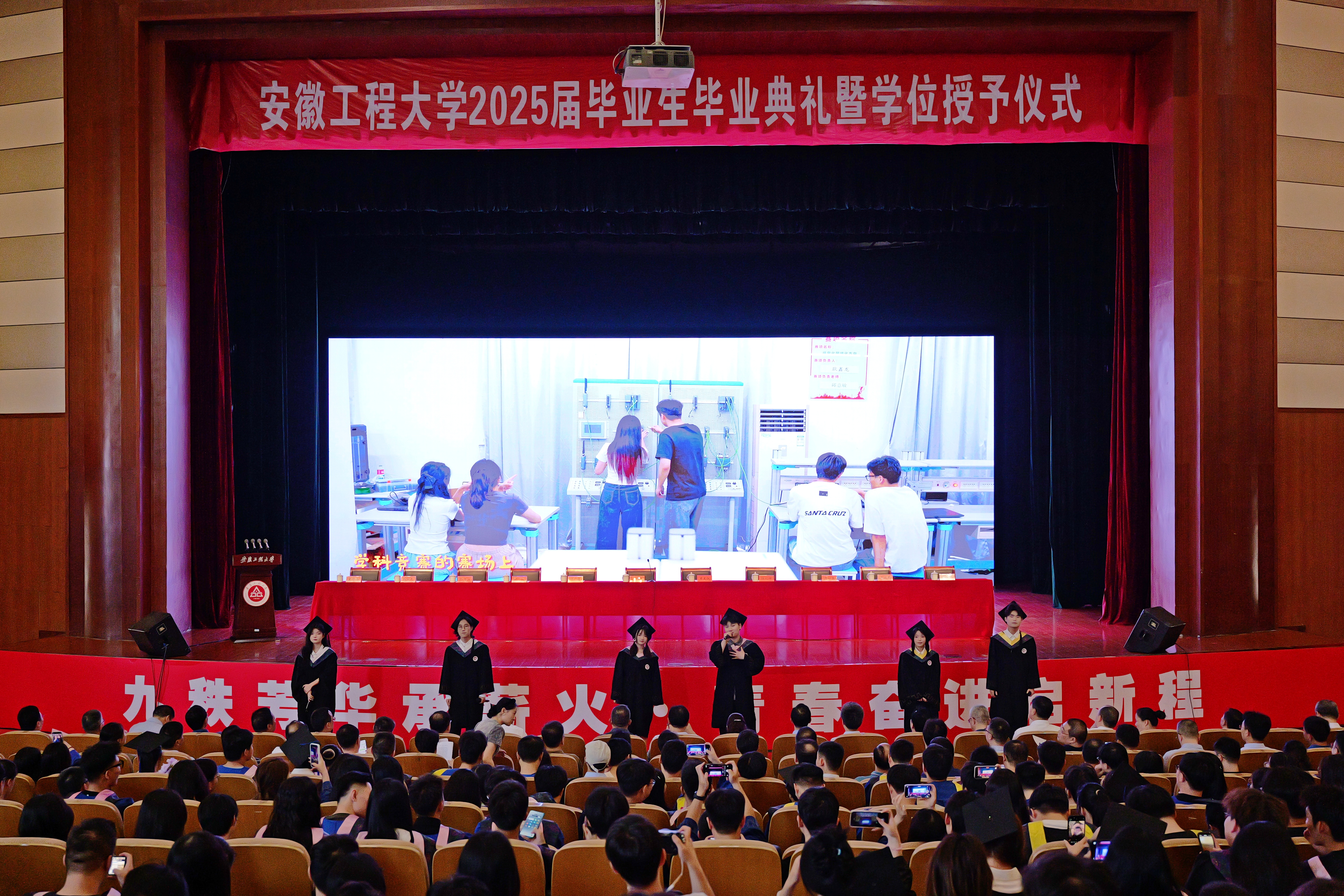 王成军宣读学士学位授予决定,周虹屏宣读硕士学位授予决定,张开炳宣读2025年省级、校级优秀毕业生文件。校领导依次为本科毕业生代表、硕士毕业生代表、留学生代表颁发毕业证书、学位证书、拨正流苏,并为2025年省级、校级优秀毕业生代表颁发荣誉证书。