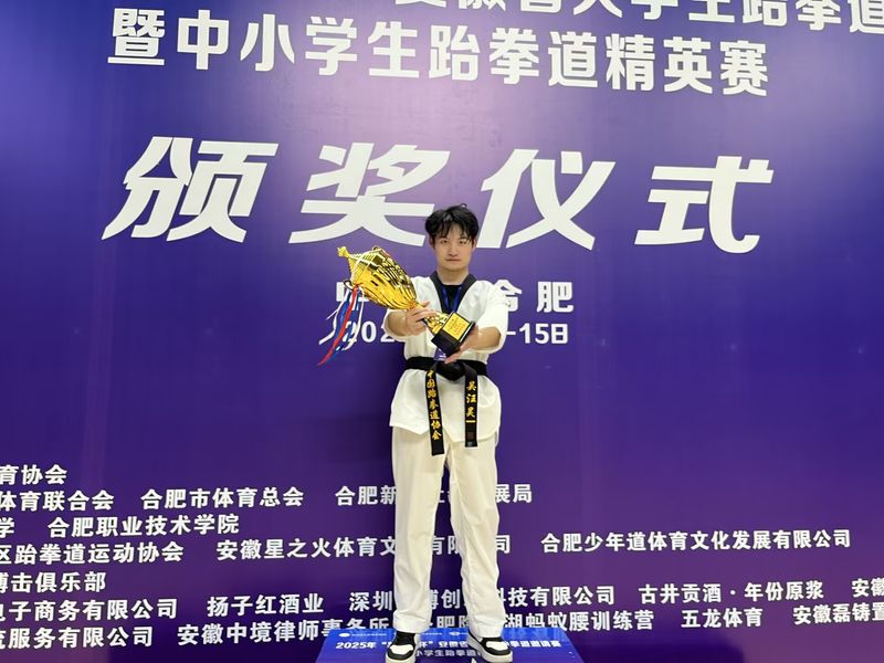 本网讯 近日,安徽省第二届大学生跆拳道邀请赛在合肥落幕,我校跆拳道校队取得3金2银1铜的好成绩。其中吴汪昊、胡峥嵘、丁玉娴荣获“优秀运动员”称号,张振霖获得“优秀教练员”称号,跆拳道校队获“体育道德风尚奖”。