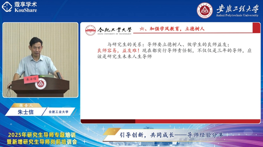本网讯 9月19日,学校在A座104会议室举行“2025年研究生导师专题培训暨新增研究生导师岗前培训会”,邀请合肥工业大学朱士信教授作专题报告。全体在岗研究生导师,学院分管研究生工作负责人、研究生秘书等参加。会议采用了线上线下同步进行的方式。