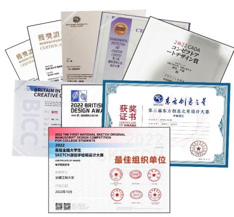 近一学年,产品设计二年级和三年级同学在全国工业设计大赛获得二等奖1项、三等奖3项;安徽省第九届全国工业设计大赛赛区获二等奖1项;第二届BICC中英国际创意大赛中获铜奖5项;第四届香港大学生当代设计奖获铜奖5项;在首届中国文化办公用品创意设计、2022SGADC-新加坡金沙艺术设计、“包豪斯奖”国际设计、第六届国际环保公益设计、第四届日本新概念设计赛等赛事中获奖频频。