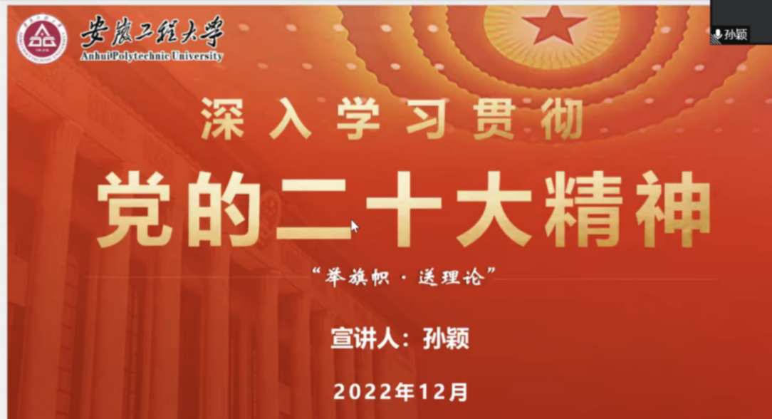 1223日上午,设计学院通过线上开展了党的二十大精神宣讲。校宣讲团成员、经济与管理学院副教授孙颖主讲。设计学院党委书记胡家增主持,学院党委理论学习中心组成员、学院教职工、部分学生党员参加。