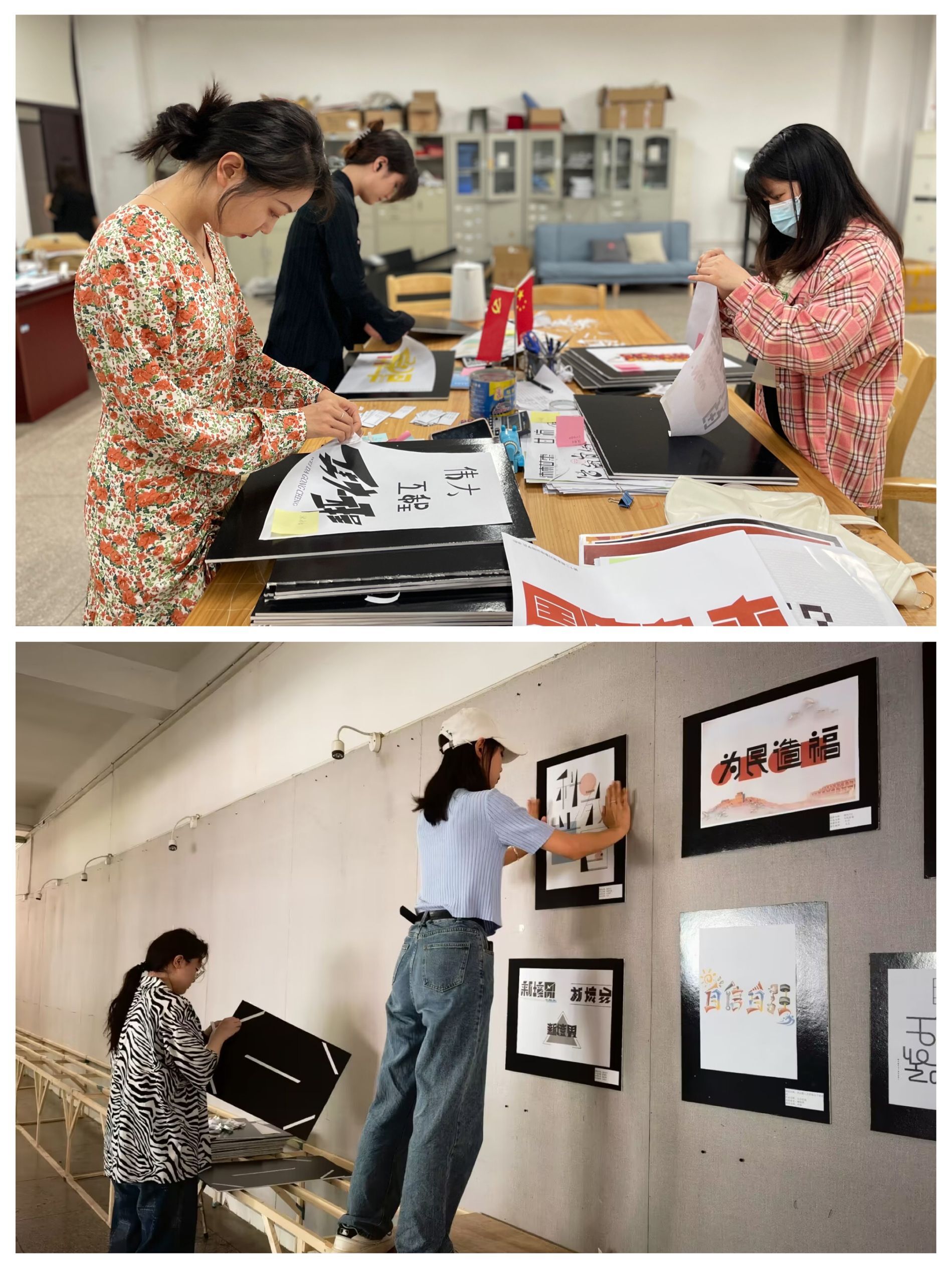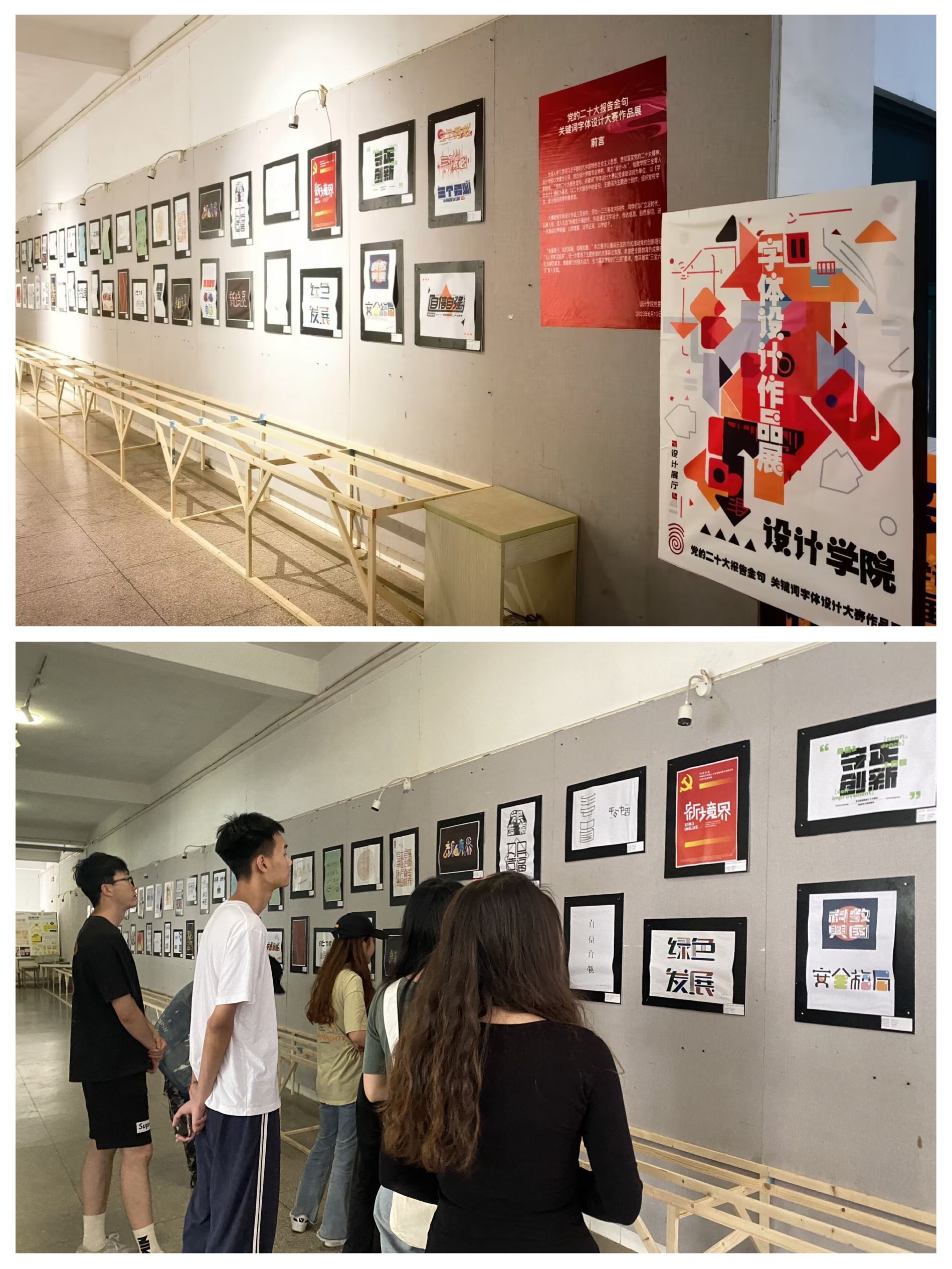 学院党委将“设计+实践育人贯穿于学习贯彻习近平新时代中国特色社会主义思想主题教育全过程,将思想政治教育与设计作品展相结合,打造“大思政”工作格局,以实际行动确保主题教育取得实效。本次“党的二十大报告金句、关键词”字体设计优秀作品在7号教学楼进行展览。参赛同学秉承“立足时代、扎根人民、深入生活”的理念开展创作、布展、展览。参展作品通过汉字设计,传达信息,自然亲切,集中展示了学院党校和《字体设计》课程教学团队的探索性育人成果。作品展至6月中旬开展以来,学院广泛宣传,吸引了众多师生前往看展,以喜闻乐见的方式推动党的创新理论“飞入寻常百姓家”,通过展览的形式既丰富了校园文化,又营造了主题教育的浓厚学习氛围。