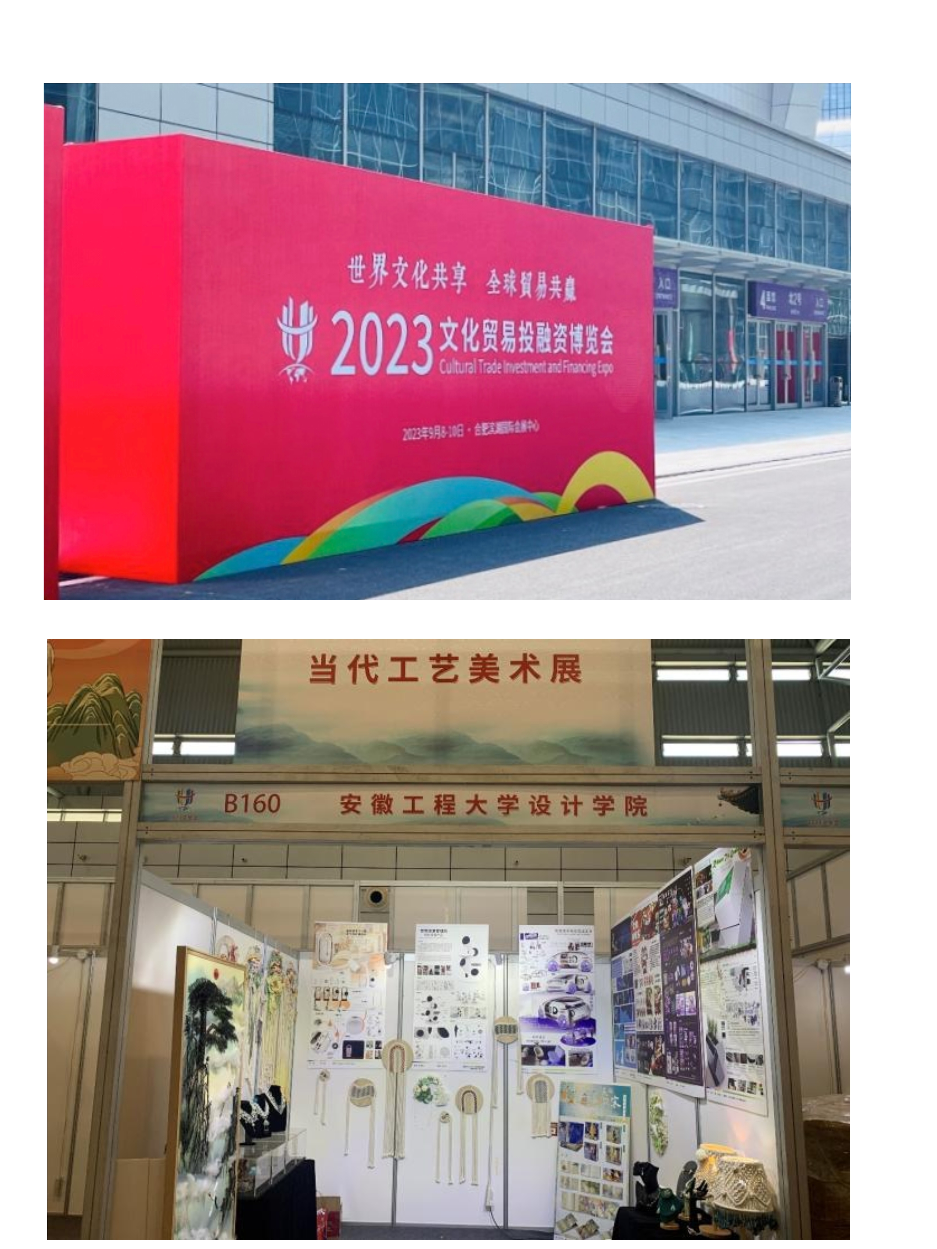 设计学院组织部分师生赴合肥,挑选了产品设计、工业设计、视觉传达设计、环境设计、工艺美术等专业作品参加了2023文化贸易投融资博览会当代工艺美术展。展览作品得到社会广泛认可,多个企业就学生的设计作品向学院寻求进一步合作,部分手工饰品当场售卖,反响良好。