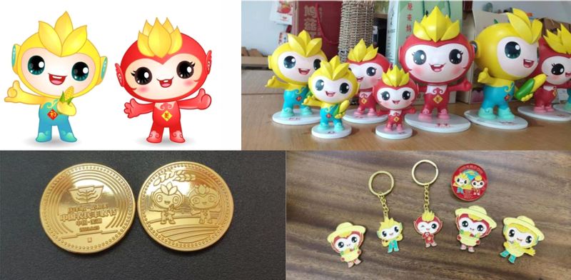 6月中旬开始,黄卫国老师还投入到吉祥物衍生产品的开发中,前后开发了几十款周边产品,包括大型玻璃钢雕塑、吉祥物树脂手办礼品、穿戴人偶服、丰收节纪念币、冰箱贴、钥匙扣、滴胶印章手办、抱枕、鼠标垫、毛绒娃娃等。此外,他还承担了吉祥物相关动画短片设计、表情包开发工作。