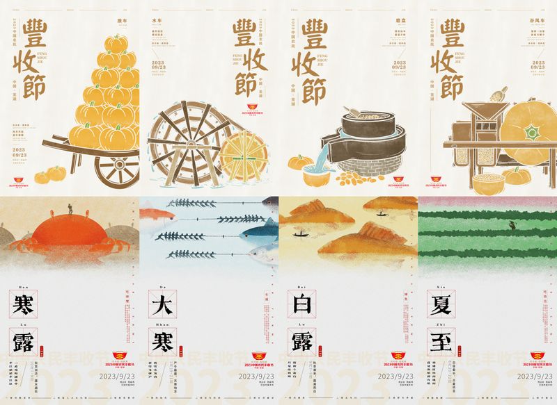 为营造主场活动的节日气氛,从6月中下旬开始,王小元教授、刘华玉副教授就带领团队进行丰收节主题海报策划与设计,经过多轮反复的讨论、修改、深化,共设计原创作品100多幅,其中王小元教授带领团队设计的农民画系列的二十四节气海报;刘华玉副教授带领团队设计的国潮风系列的二十四节气海报得到丰收节组委会认可,并予以采用。在芜湖的高铁、飞机场、公交站台、路边宣传栏、主会场的停车场、会展建筑上,处处能看到这些精美的主题海报,凸出营造热烈、喜庆、节俭的节庆氛围。