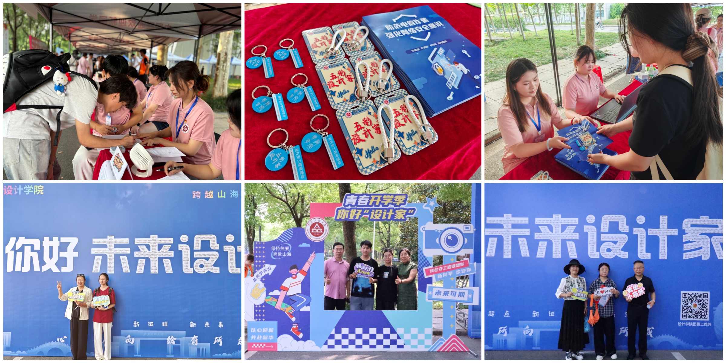 设计学院以“特色赋能”为核心,为新生打造沉浸式迎新体验,不仅赋予新生诗意的仪式感,更贴心地准备了实用的物品。反诈教育宣传页如警钟长鸣,以鲜活案例为新生织就安全网,提醒学子初入大学保持清醒与警惕。专属定制卡套与钥匙扣是徽程的独特信物,承载着学院对新生“扎根生长、勇敢追梦”的美好期许。签名墙上,墨迹未干,记录着新生的憧憬;合影框中,光影流转,定格青春笑脸。这些细节无不彰显着设计学院的用心与创意,让新生们在踏入校园的第一天就感受到浓厚的文化氛围和艺术气息。